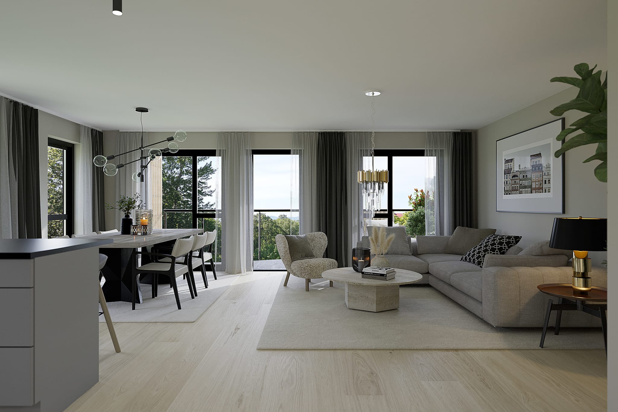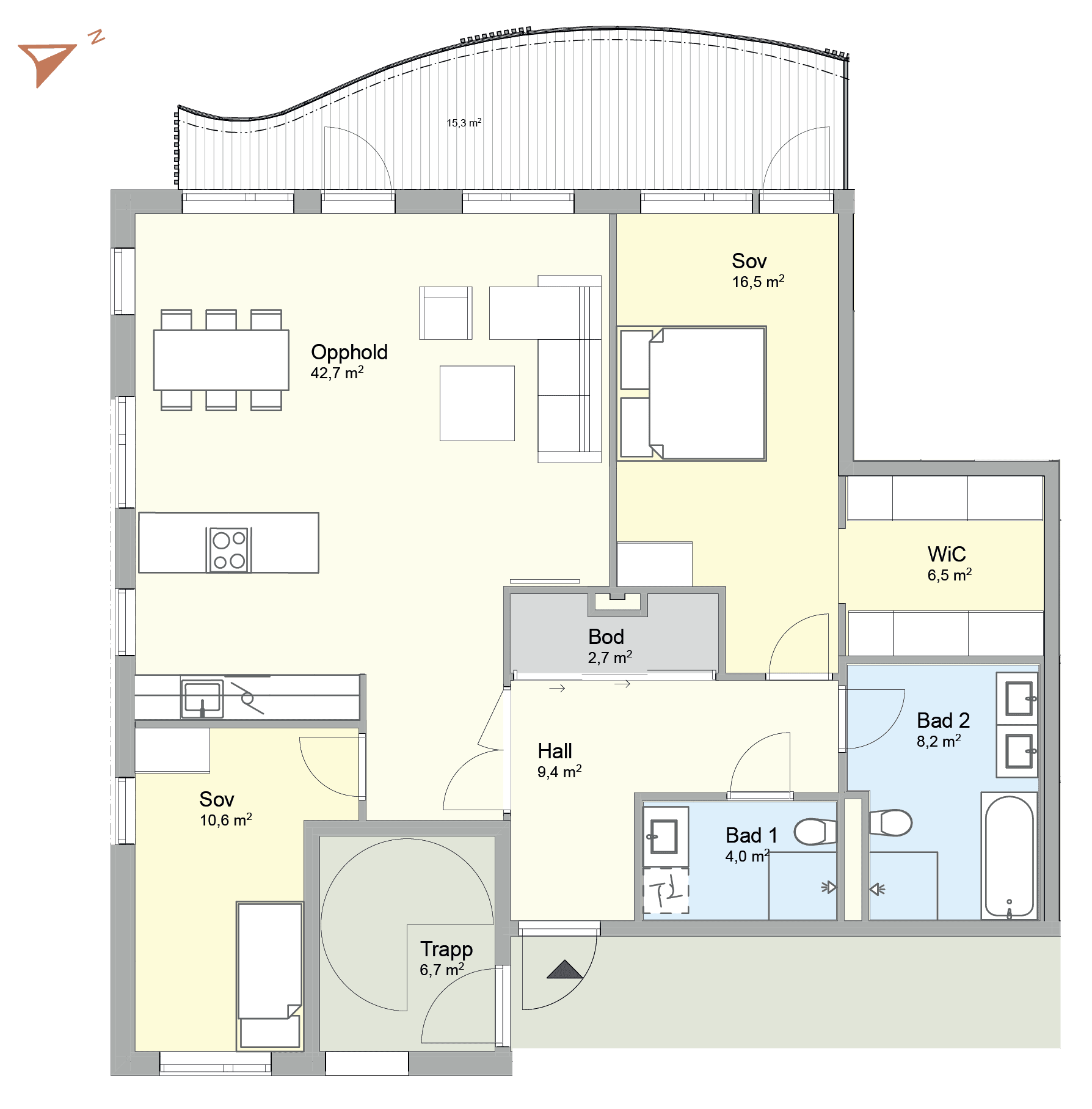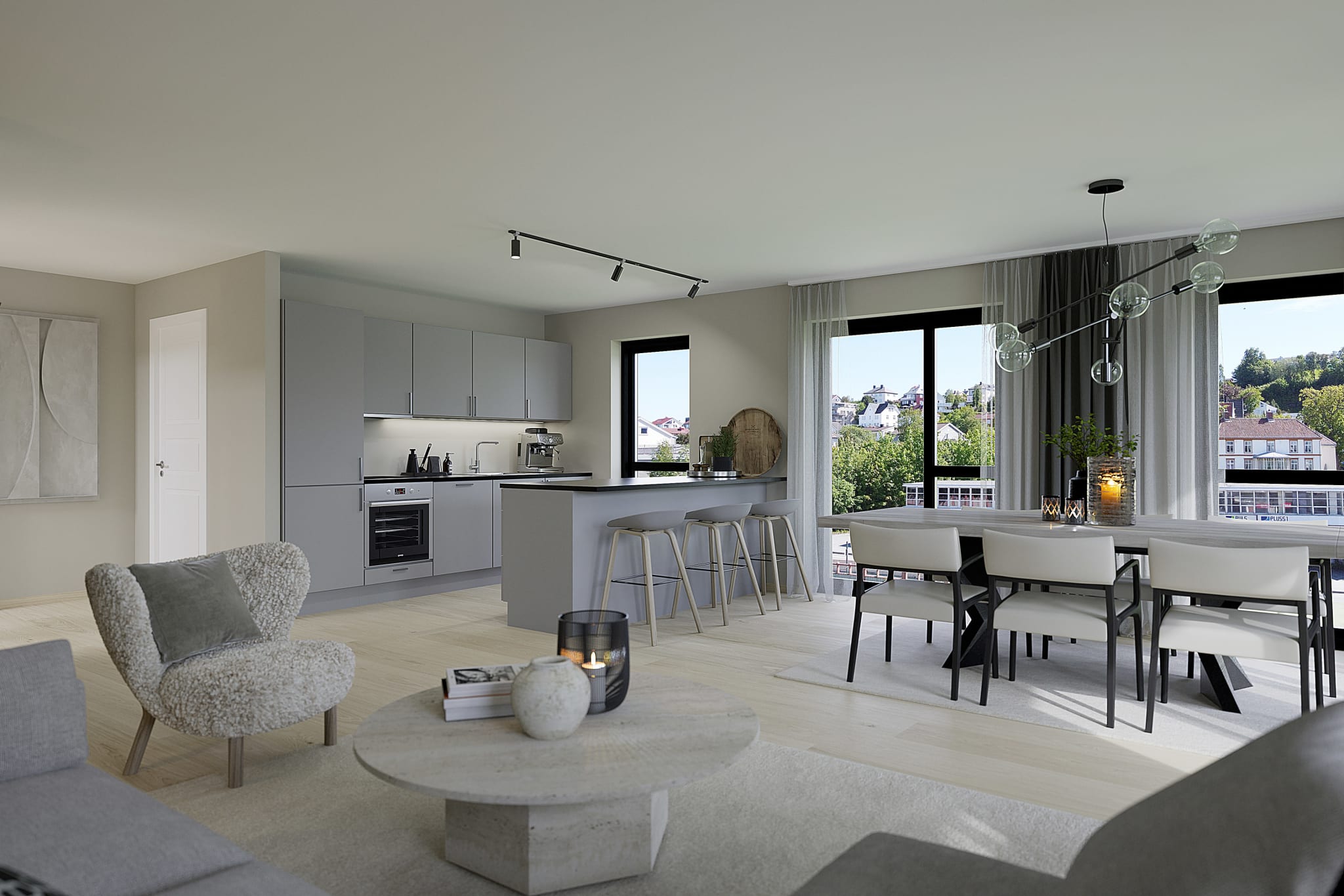Toppleilighet med vestvendt terrasse på 15 m2. Leiligheten har to bad, hovedsoverom med walk-in closet, innvendig bod, åpen stue- og kjøkkenløsning på 42 m2. Parkering i p-kjeller.