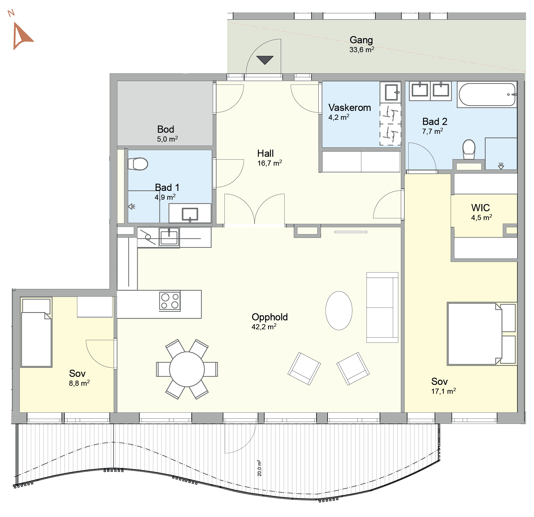 Toppleilighet med sørvendt terrasse på 20 m2. Leiligheten har to bad, eget vaskerom, hovedsoverom med walk-in closet, stor innvendig bod, åpen stue- og kjøkkenløsning på 42 m2 og en stor hall på hele 17 m2. Parkering i p-kjeller.