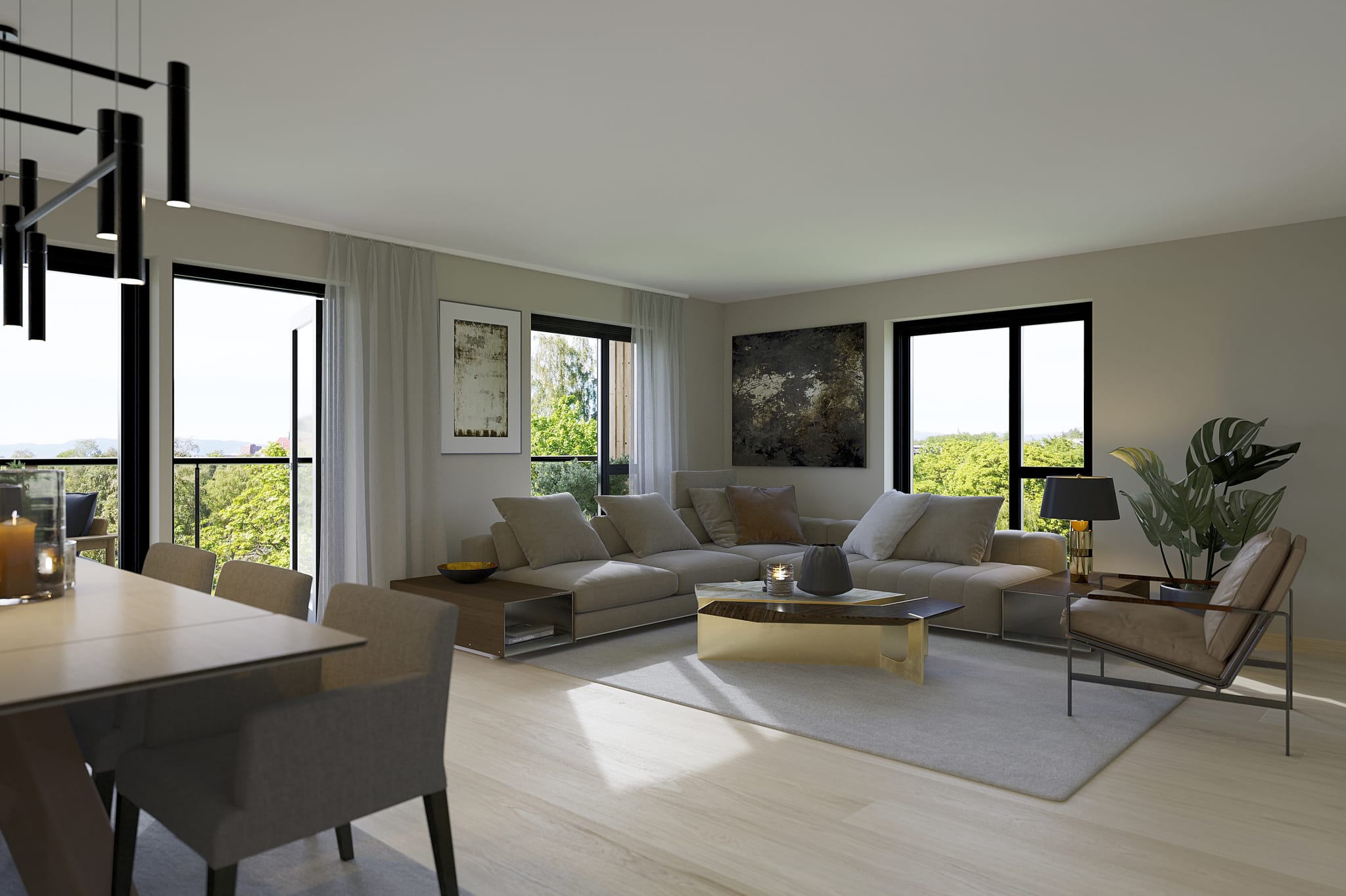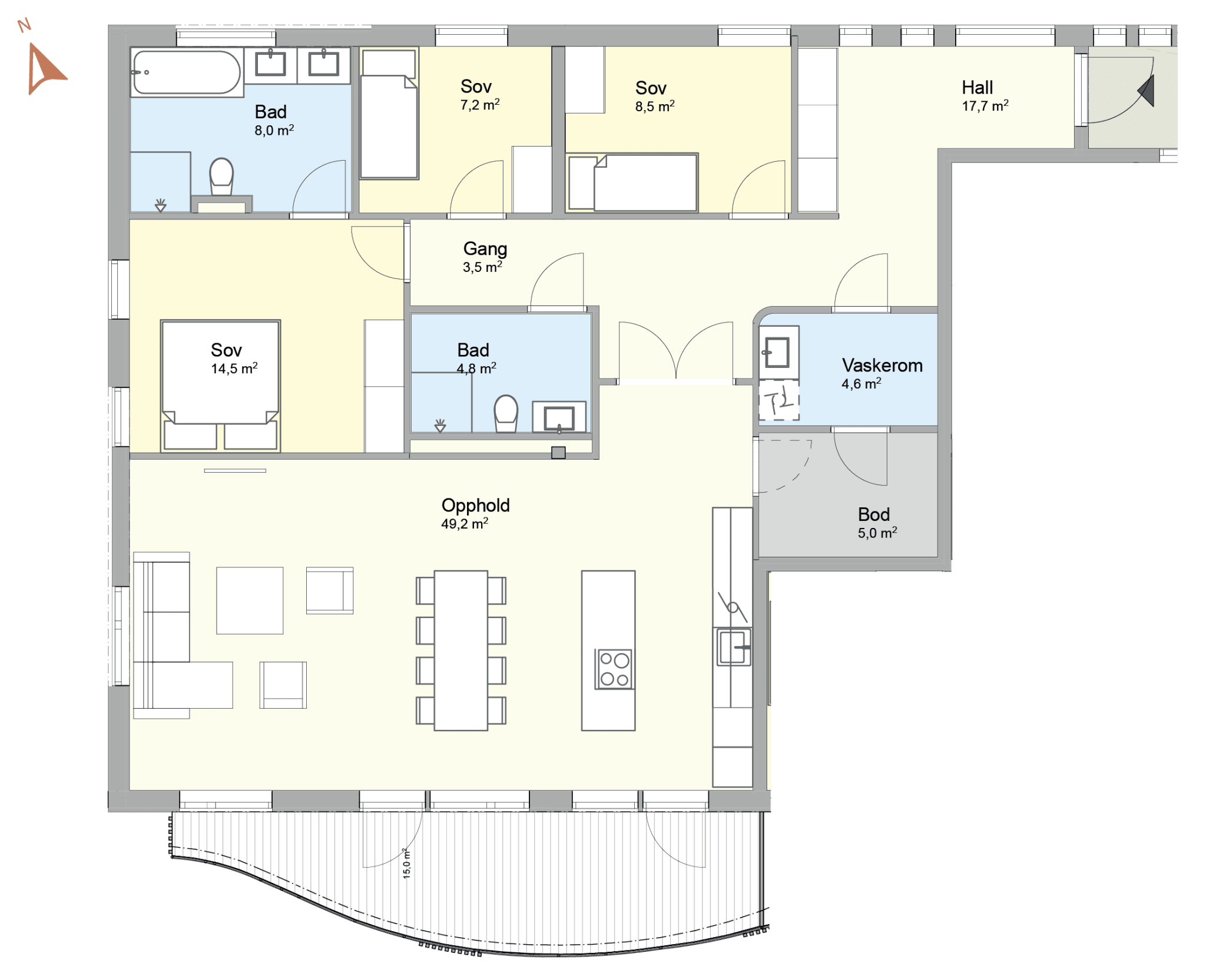 Toppleilighet med sørvendt terrasse på 15 m2. Leiligheten har to bad, eget vaskerom, tre soverom, stor innvendig bod, åpen stue- og kjøkkenløsning på 49 m2 og en stor hall med mulighet for gode garderobeløsninger. Parkering i p-kjeller.